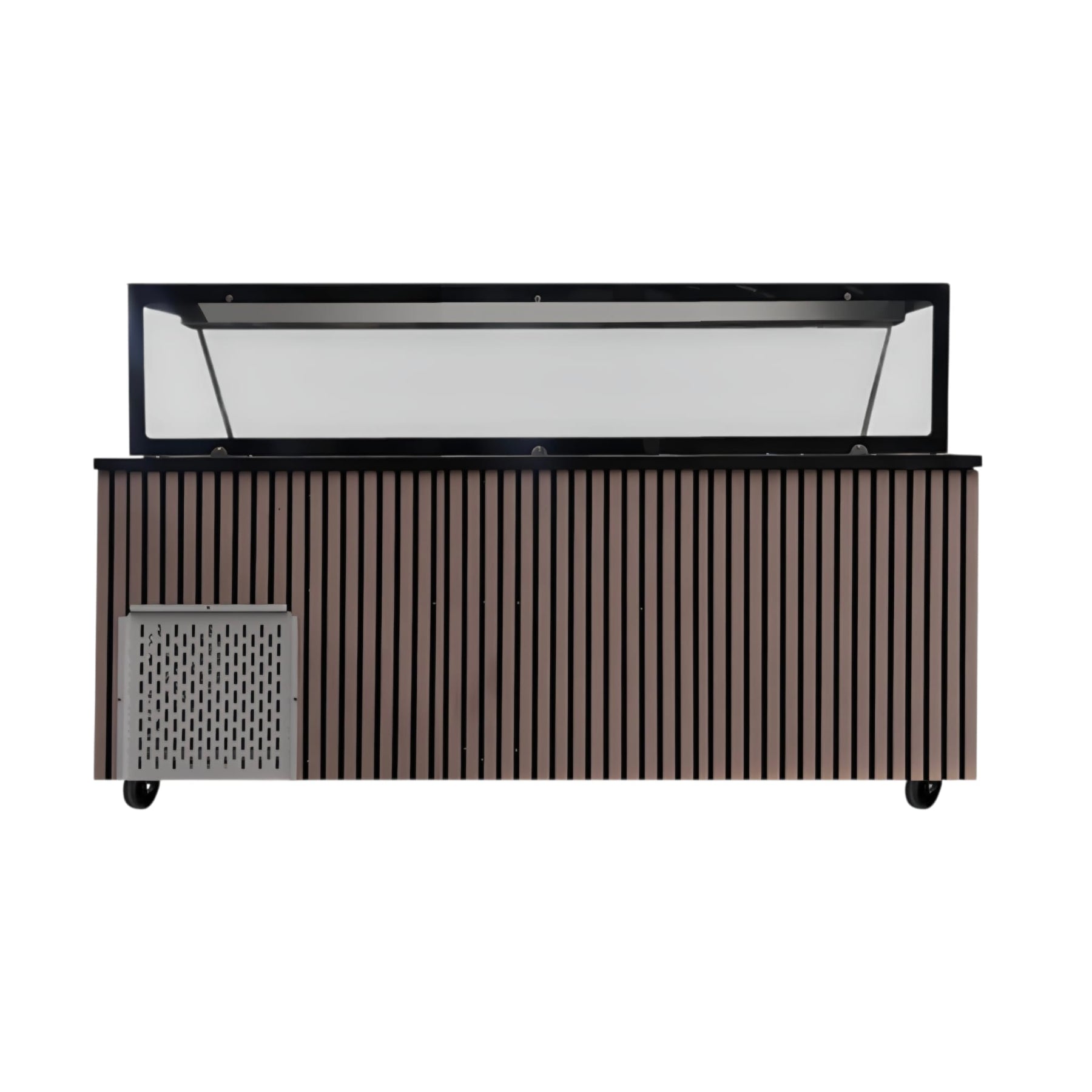 Die robuste Black Granit-Arbeitsplatte sorgt für eine langlebige und hygienische Arbeitsfläche, während die elegante Frontverkleidung in Holzoptik dem Gerät eine moderne und hochwertige Optik verleiht perfekt für offene Küchen oder gastronomische Arbeitsbereiche mit Kundenkontakt.
